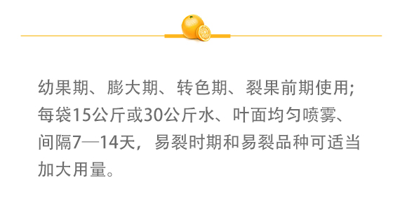 幼果期、膨大期、轉(zhuǎn)色期、裂果前期使用;每袋15公斤或30公斤水、葉面均勻噴霧、間隔7—14天,易裂時(shí)期和易裂品種可適當(dāng)加大用量。