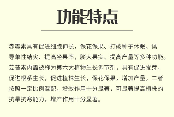 赤霉素具有促進(jìn)細(xì)胞伸長,?;ū9?、打破種子休眠、誘導(dǎo)單性結(jié)實(shí)、提高坐果率,膨大果實(shí)、提高產(chǎn)量等多種功能。蕓苔素內(nèi)酯被稱為第六大植物生長調(diào)節(jié)劑,具有促進(jìn)發(fā)芽,促進(jìn)根系生長,促進(jìn)植株生長,保花保果,增加產(chǎn)量。二者按照一定比例混配,增效作用十分顯著,可顯著提高植株的抗旱抗寒能力,增產(chǎn)作用十分顯著。