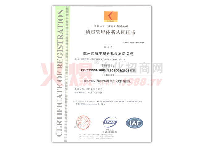 如今的海綠王,各個部門及各項規(guī)章制度均以完善,產(chǎn)品的生產(chǎn)也步入了規(guī)范化管理,起步雖晚,但成績喜人,海綠王被評為“中央電視臺AAA誠信企業(yè)”“河南衛(wèi)視《梨園春》欄目上榜品牌”、“3/15消費者信得過單位”“河南省肥料協(xié)會常務理事單位”、“河南省十佳科技型具競爭力企業(yè)”、“ISO9001質(zhì)量認證”、“2012綠色農(nóng)資品牌”、“中國果菜無公害科技示范單位”、“世界貿(mào)易組織河南省推薦單位”、“2009中國農(nóng)藥企業(yè)具成長性100強”、“河南民營企業(yè)發(fā)展促進會常務理事單位、”河南科技學院大學生就業(yè)創(chuàng)業(yè)見習基地“等數(shù)項榮譽。目前的海綠王,穩(wěn)步發(fā)展,勇于創(chuàng)新,走出了具有海綠王特色的綠色農(nóng)業(yè)發(fā)展之路,力爭為中國綠色農(nóng)業(yè)、中國新農(nóng)村的建設與發(fā)展貢獻自己的力量。